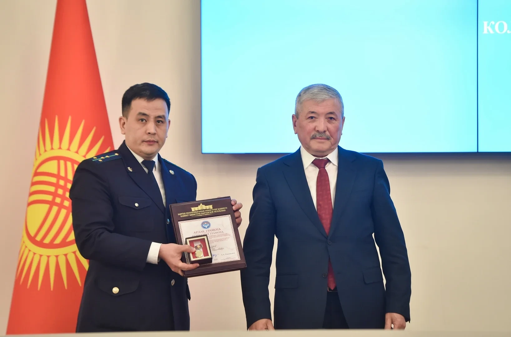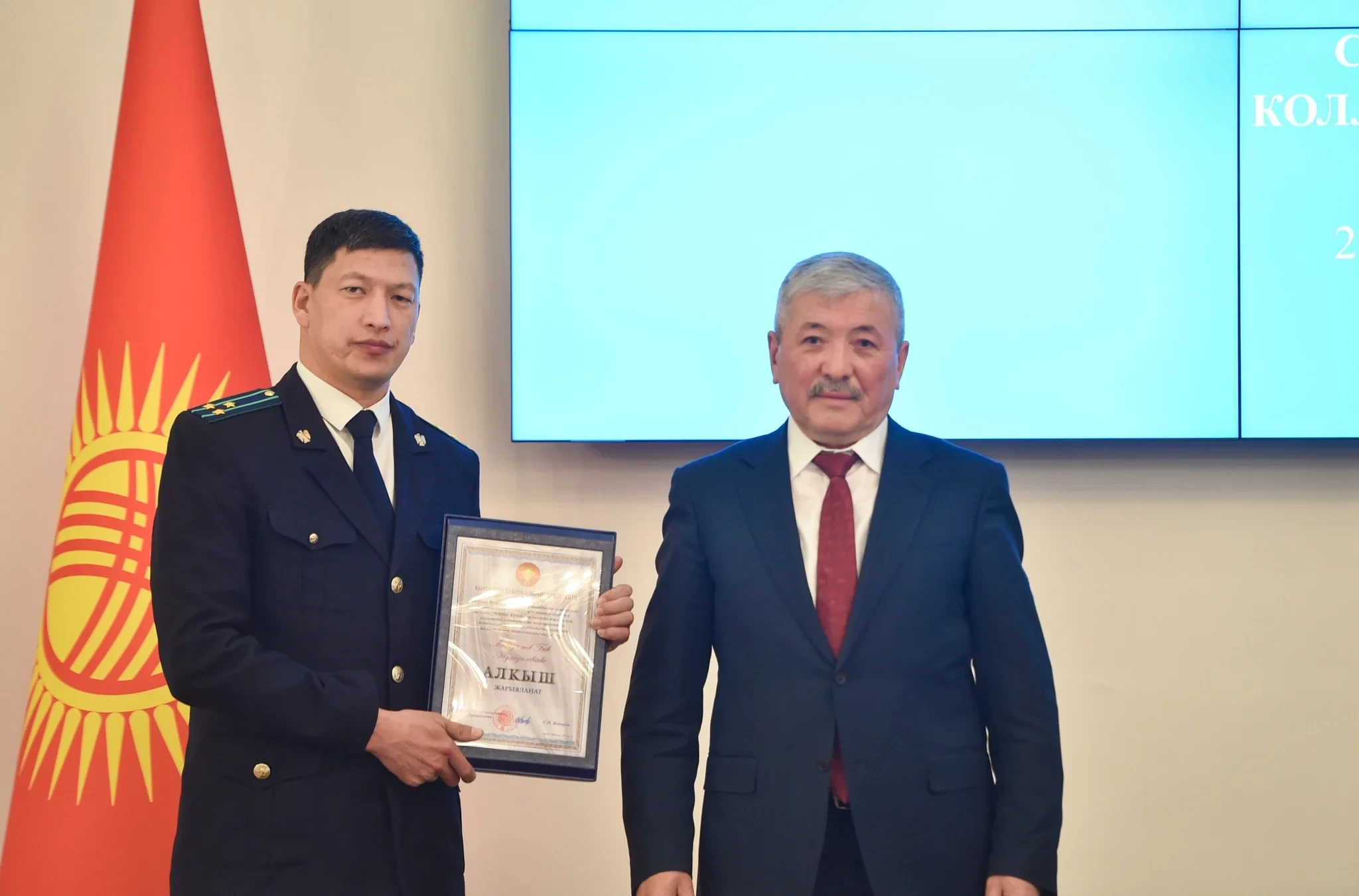 На заседании коллегии Государственной налоговой службы состоялась церемония награждения, на которой председатель кабинета министров и руководитель администрации президента Адылбек Касымалиев вручил Благодарности от имени президента Кыргызской Республики, а также почетные грамоты кабинета министров специалистам, принимавшим участие в создании автоматизированной системы налогового анализа «Салык Күзөт».Благодарность от президента страны была вручена следующим специалистам за их значительный вклад в развитие финансово-экономического потенциала: