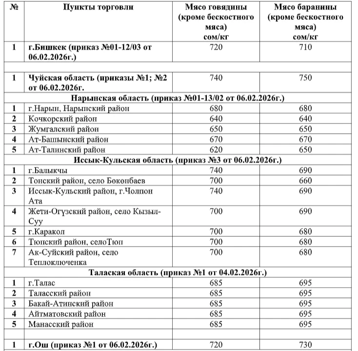 В соответствии с приказом Министерства экономики и коммерции Кыргызстана, изданным 30 января 2026 года под номером 3, вводится временное государственное регулирование цен на мясо, включая говядину и баранину (кроме бескостного мяса) на территории страны. В рамках данного регулирования, территориальные подразделения Антимонопольной службы определили следующие предельные цены: