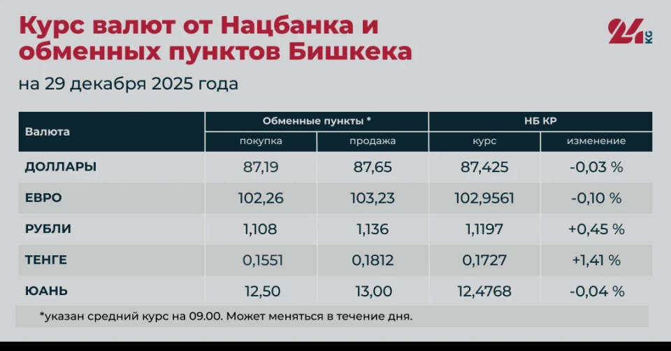- На утро 29 декабря 2025 года курс доллара США в банках Кыргызстана колеблется в пределах 87,1-87,3 сома при покупке и 87,55-87,8 сома при продаже. Что касается евро, его стоимость варьируется от...