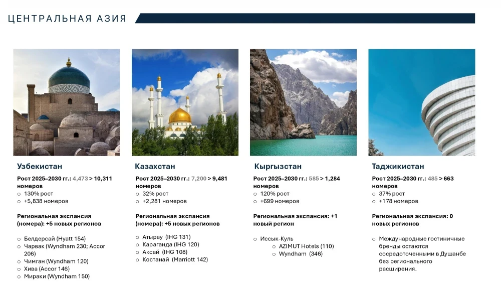 С 2025 по 2030 годы ожидается, что количество гостиничных номеров международных брендов в регионе Центральной Азии увеличится почти в два раза. Ведущими игроками на рынке станут Accor (19%), Hilton (18%) и IHG (по 17%).