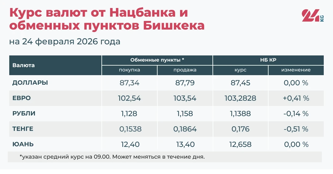 - В обменных пунктах: покупка — 102,54 сома, продажа — 103,54 сома.