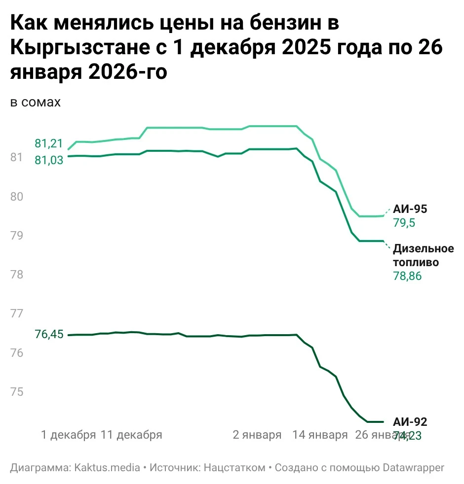 Согласно данным Нацстаткома, в январе цены на бензин АИ-92 снизились до 74 сомов за литр, АИ-95 – до 79 сомов, а дизель – до 78–79 сомов. Снижение составило около 2-3 сомов за литр и связано с корректировкой оптовых цен и сезонным снижением спроса.