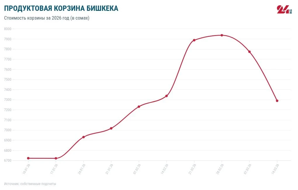 Согласно проведенному анализу, с начала нашего наблюдения в конце октября 2018 года, стоимость продуктовой корзины возросла на 4 тысячи 20 сомов. С начала текущего года она увеличилась на 567 сомов, а по сравнению с аналогичным периодом 2025 года — на 1 тысячу 147 сомов.