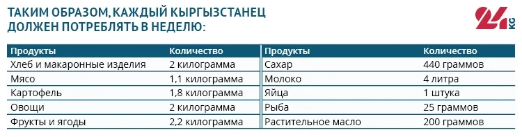 В 2009 году правительство Кыргызстана утвердило нормы питания для граждан. Согласно этому документу, каждый житель страны обязан ежемесячно потреблять 9 видов продуктов питания.