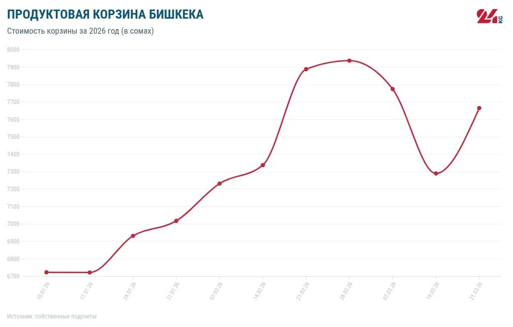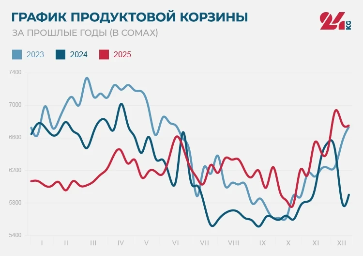 В 2025 году стоимость продуктовой корзины увеличилась на 686 сомов. Наименьшая цена была зафиксирована 18 октября — 5 тысяч 791 сом, а максимальная — 6 декабря, достигнув 6 тысяч 927 сомов.