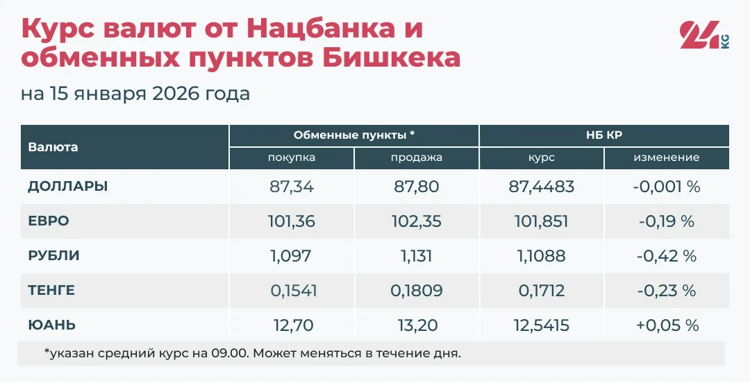 На основе данных Национального банка Кыргызстана и обменных пунктов в Бишкеке, официальный курс доллара, евро, российского рубля и казахского тенге демонстрирует снижение, тогда как китайский юань продолжает расти.