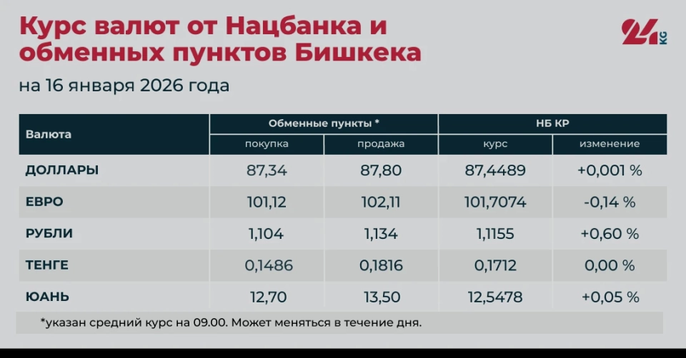 На 16 января официальные курсы доллара, российского рубля и китайского юаня увеличились, тогда как евро показал снижение. Казахский тенге остается без изменений. Эти данные предоставлены Национальным банком Кыргызстана и обменными пунктами Бишкека.