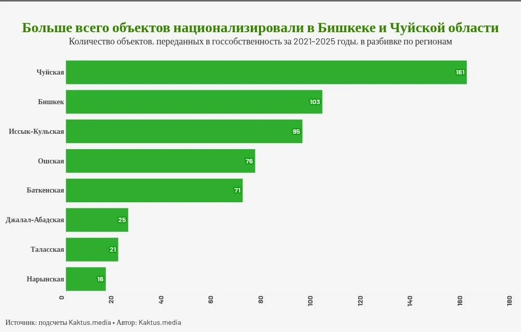 В региональном разрезе наибольшее количество объектов, как по количеству, так и по общей площади и стоимости, изъято в Чуйской области. В то время как Таласская и Нарынская области остаются регионами с наименьшим количеством национализированного имущества, где объектов было изъято соответственно в восемь и десять раз меньше, чем в Чуйской области.