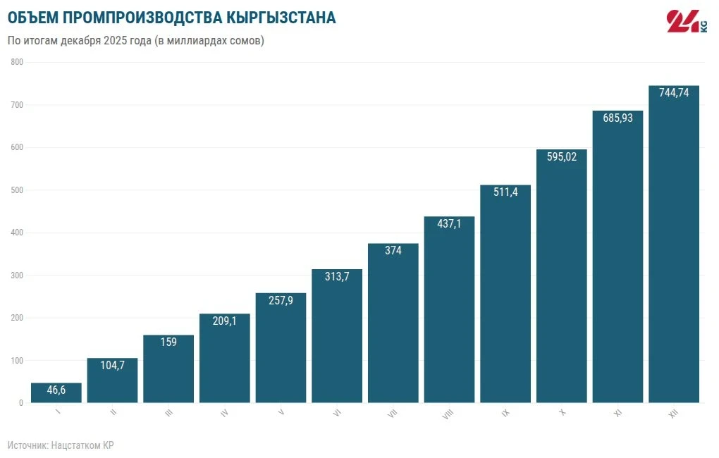 В 2025 году объем промышленного производства достиг 799 миллиардов 740,6 миллиона сомов, что соответствует росту на 10,6 процента по сравнению с предыдущим годом. Это стало возможным благодаря увеличению объемов производства: