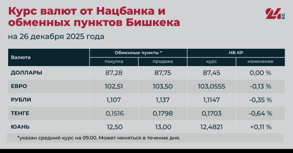 - На утро 26 декабря 2025 года курс доллара США в банках Кыргызстана составляет 87,2-87,3 сома (покупка) и 87,7-87,8 сома (продажа). Евро можно приобрести по цене 102-102,8 сома (покупка) и продать...