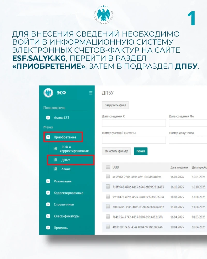 - Вход в систему осуществляется через сайт esf.salyk.kg. Затем необходимо перейти в раздел "Приобретение" и выбрать подраздел ДПБУ.
