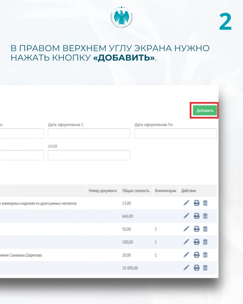 - В правом верхнем углу страницы следует нажать кнопку "Добавить". В открывшемся окне отметьте опцию "Внесение сведений о драгоценных ювелирных изделиях из драгоценных металлов".