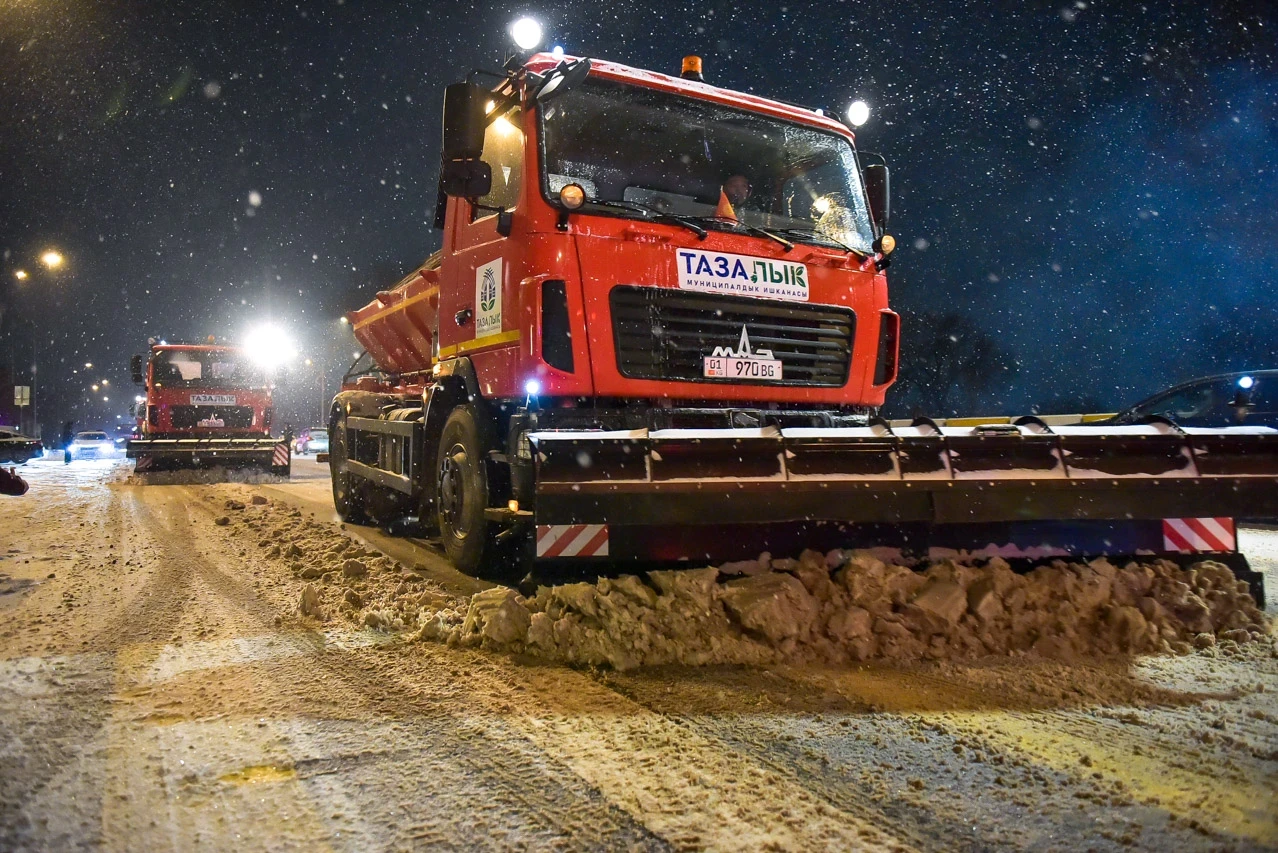 The municipal enterprise "Tazalyk" has switched to an enhanced work regime. Since early morning, specialized equipment has been actively used on the streets of the city, with snow removal and the application of anti-icing materials being carried out around the clock.
