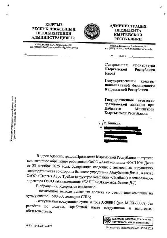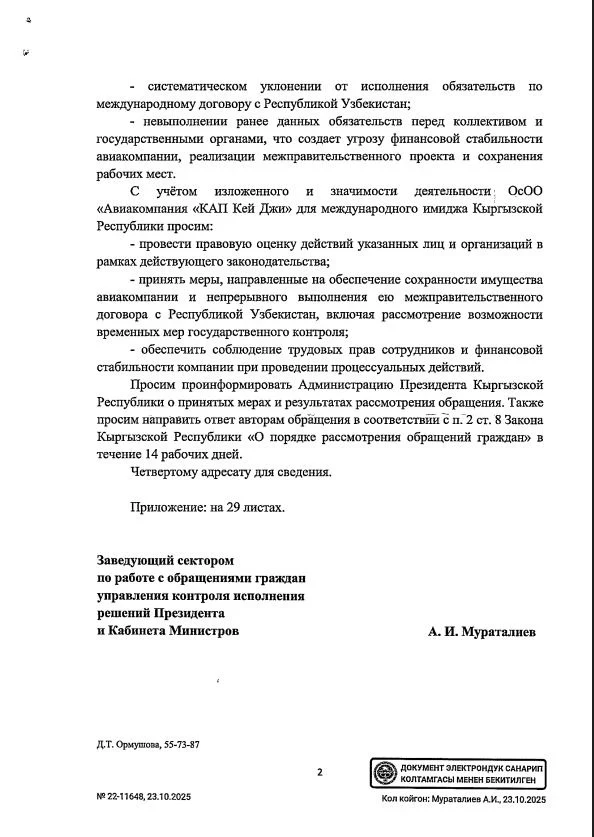 As a result, Kyrgyzstan has found itself in an unfavorable light on the international stage, which may negatively affect its exit from the EU blacklist, noted representatives of the airline.37 employees of "KAP Key Ji" have appealed to the President of Kyrgyzstan, Sadyr Japarov, sharing their difficulties.