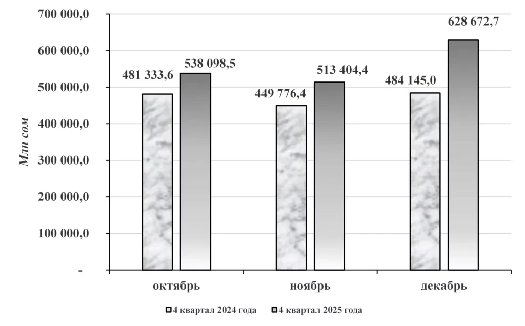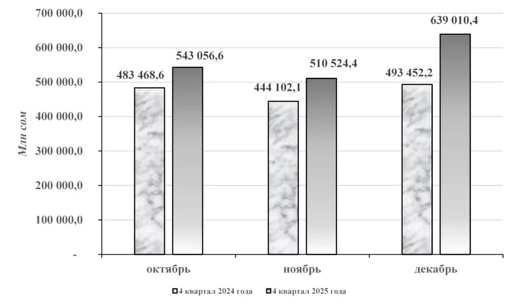 В IV квартале 2025 года в кассы коммерческих банков поступило 1 680 175,6 миллиона сомов. Это на 264 920,6 миллиона сомов больше, чем в IV квартале 2024 года, что соответствует росту на 18,7 процента.