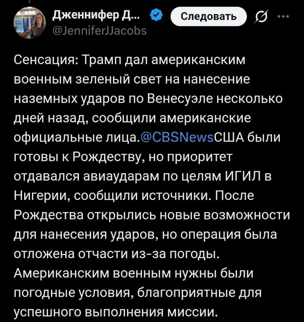 По информации CBS News: Трамп предоставил разрешение на наземные удары по Венесуэле за несколько дней до их проведения. Источники сообщают, что военные обсуждали возможность удара на Рождество, однако приоритет был отдан атакам на объекты ИГИЛ в Нигерии. В последующие дни возникли новые возможности для атак, однако операция была отложена из-за неблагоприятных погодных условий, на чем настаивал Пентагон.