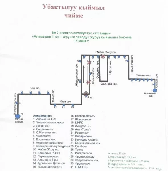 Маанилүү белгилеп өтүүчү нерсе, маршрут №2 Аламедин-1 микрорайонунан башталып, Фрунзе заводунда (Интергельпо көчөсү) аяктайт.