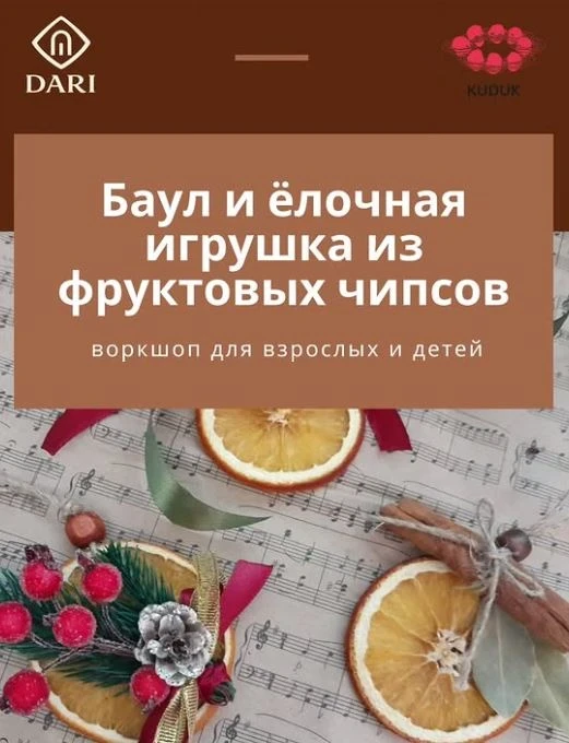 Приглашаем на новогодний воркшоп, где вы создадите елочную игрушку из натуральных фруктовых чипсов, наслаждаясь атмосферой праздника.