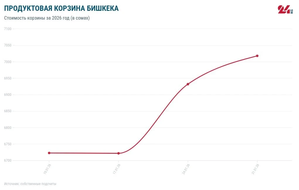 В течение 2025 года корзина подорожала на 686 сомов. Минимальная стоимость была зарегистрирована 18 октября и составила 5 тысяч 791 сом, тогда как максимальная цена была зафиксирована 6 декабря — 6 тысяч 927 сомов.