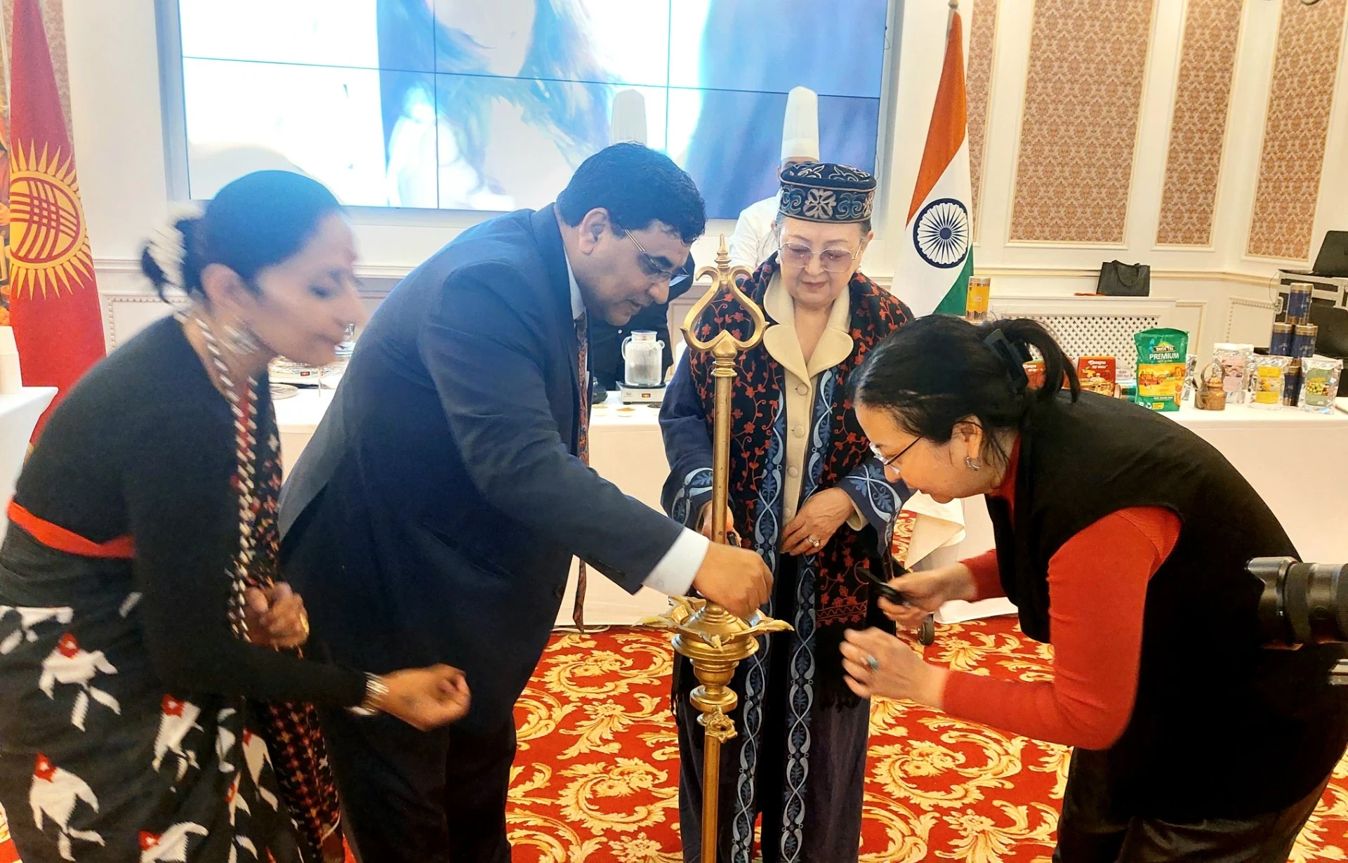 Открытие мероприятия началось с зажжения церемониальной лампы, символизирующей свет, гармонию и спокойствие. Среди участников были Чрезвычайный и Полномочный Посол Индии в Кыргызстане Бирендер Сингх Ядав, председатель Конгресса женщин Кыргызстана Замира Акбагышева и другие гости.