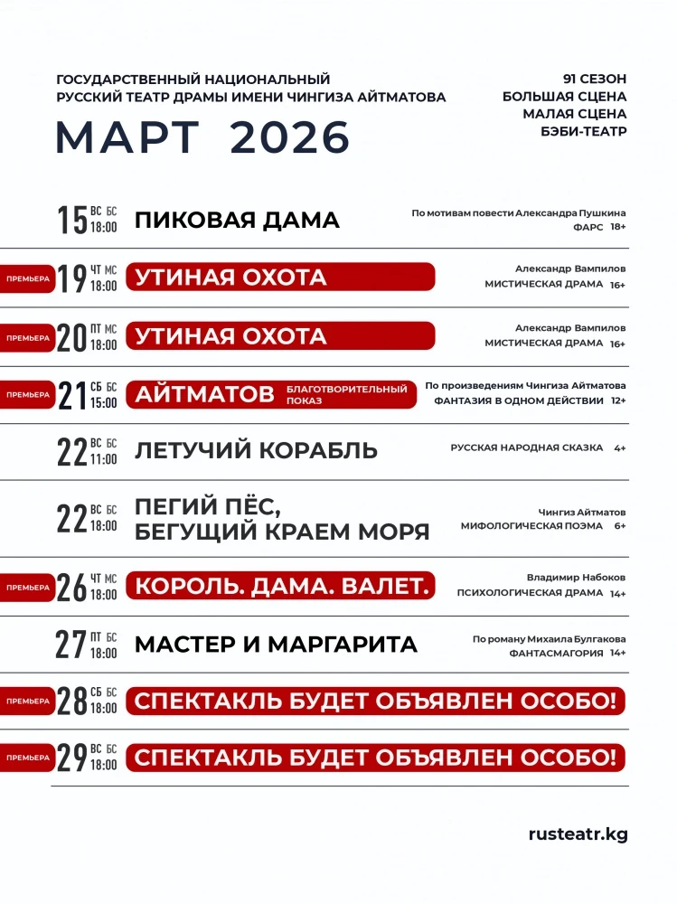 - Адрес театра: Бишкек, ул. Тыныстанова, 122 (Дубовый парк).