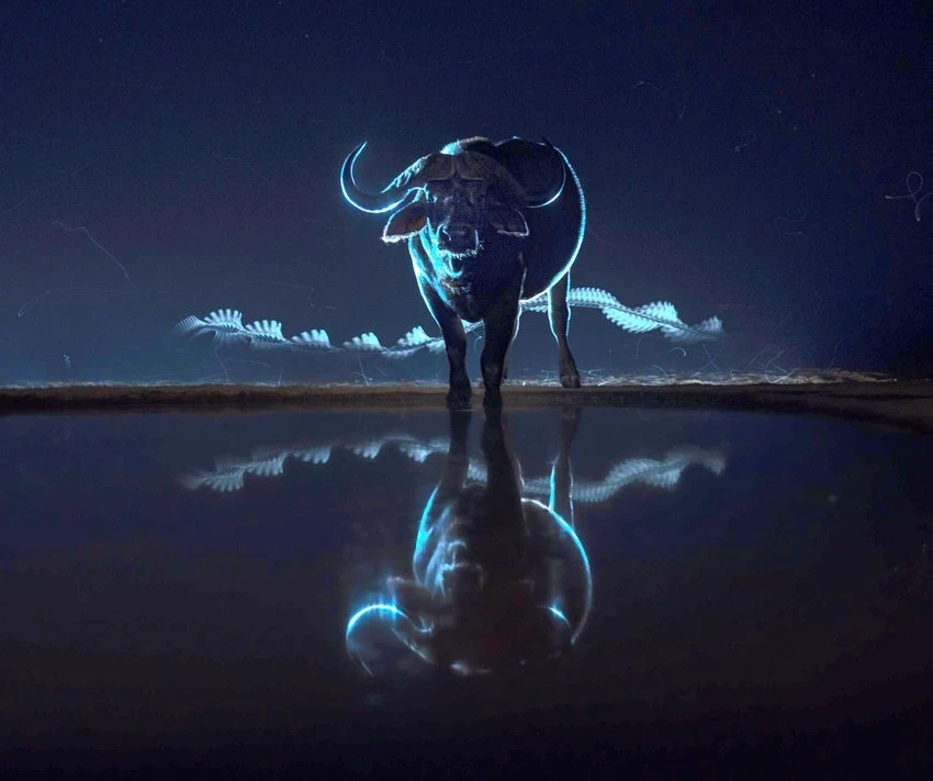 Фотограф долго ждал, пока африканский буйвол отразится в темной воде. Сильный контровой свет создал эффектный силуэт и выделил его рога, в то время как длительная выдержка запечатлела летучую мышь, создавая иллюзию призрачной формы.