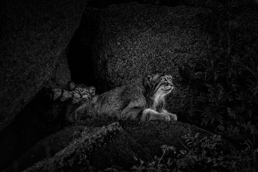 После утренних игр котят мать кота Палласа вернулась с грызуном. Первый, добежавший до нее, забрал добычу. На этом снимке яркие глаза малыша отражают его озорной характер.