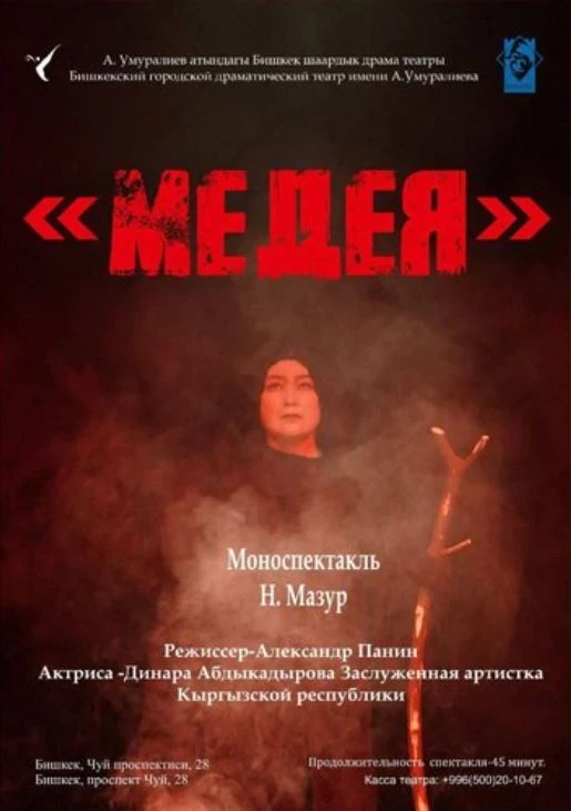 Талантливая актриса, заслуженная артистка КР Динара Абдыкадырова, в этом спектакле создает яркий и современный образ Медеи, акцентируя внимание на боли и страсти, которые она испытывает. Это история о любви и потере.