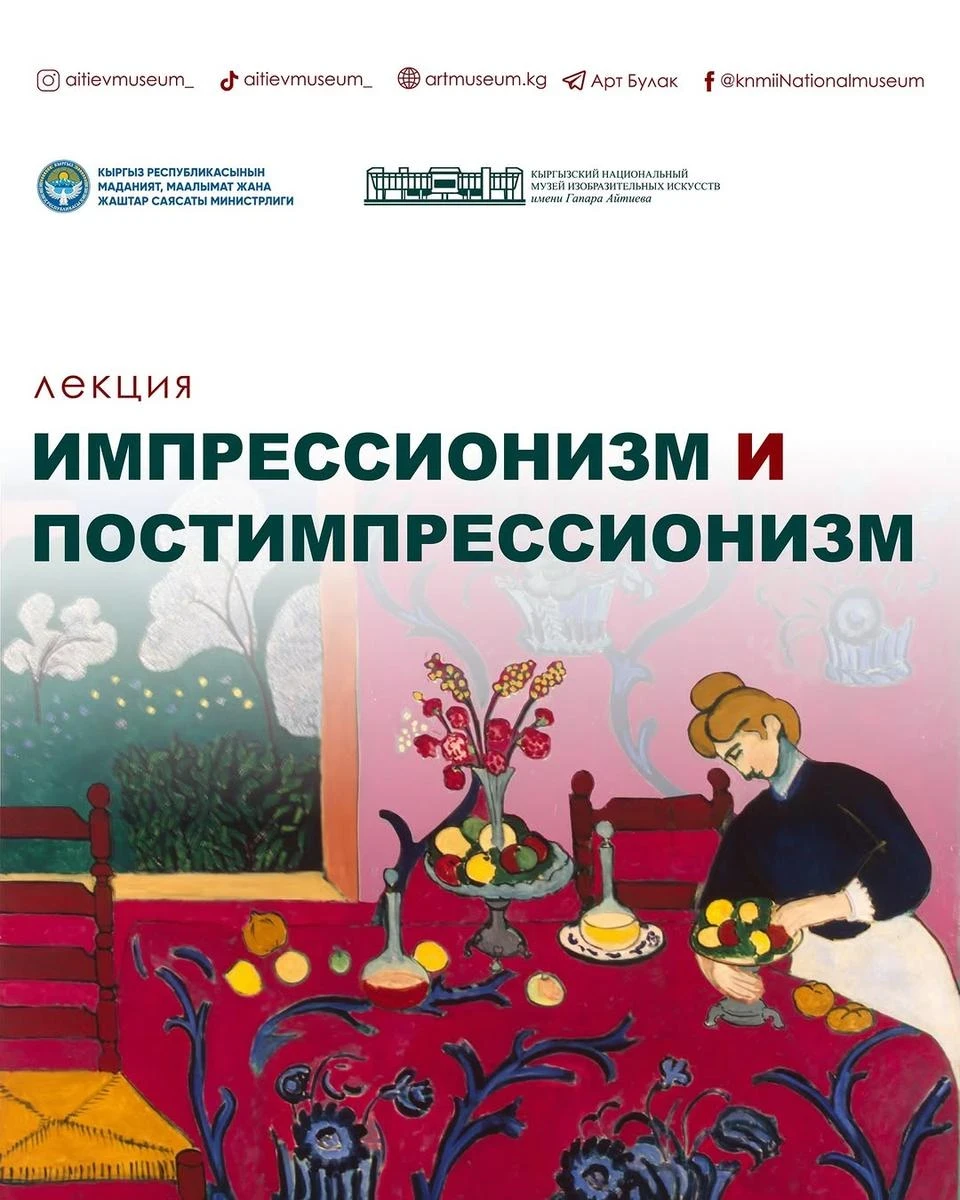 На лекции, проводимой искусствоведом Акжибек Бейшебаевой, будут обсуждены ключевые моменты импрессионизма и постимпрессионизма.