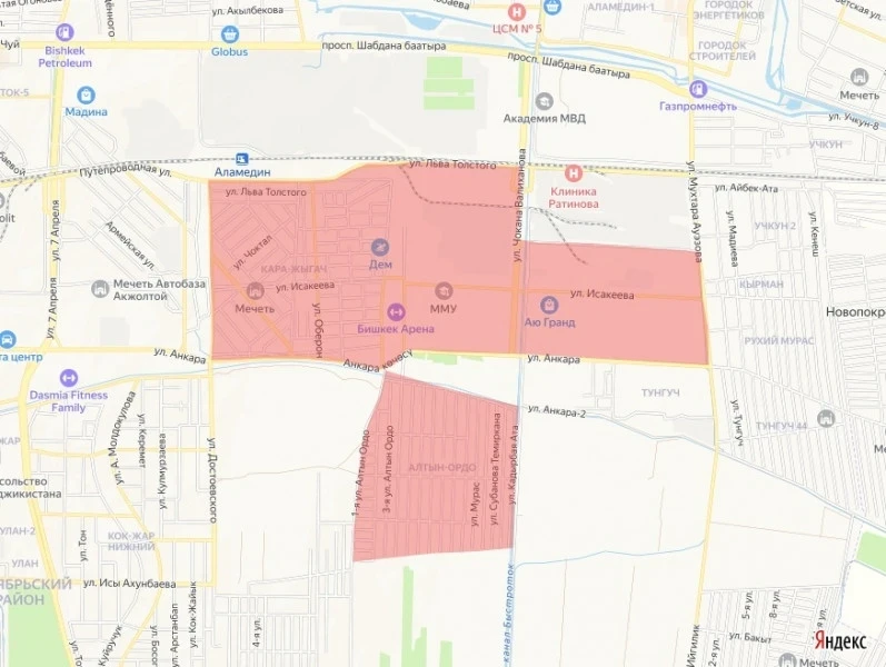 Зоны отключения включают улицы Достоевского, Анкара, Ауэзова и территорию вдоль железнодорожной линии. В список также вошли жилые массивы «Алтын Ордо», «Кара-Жыгач» и Полицейский городок.