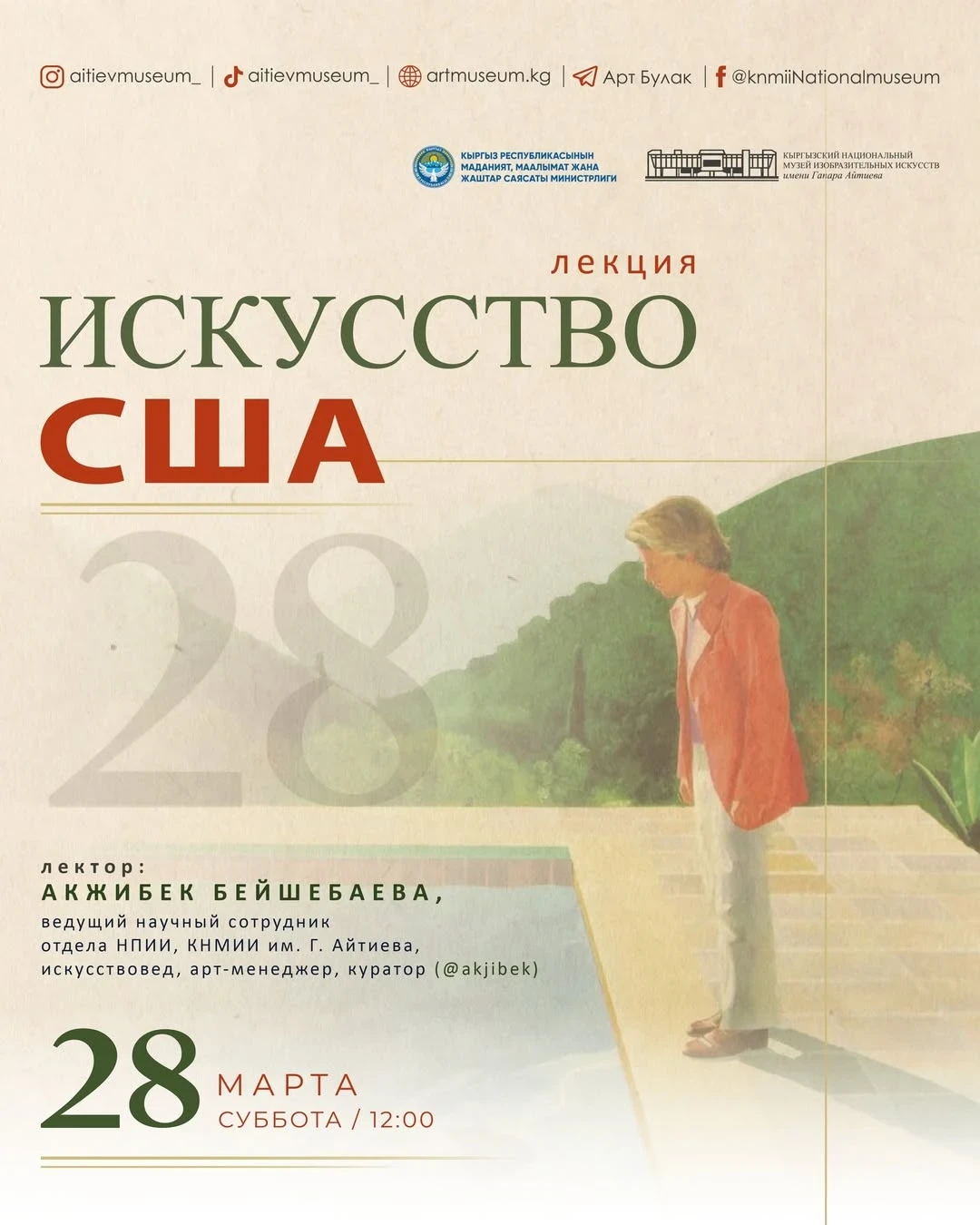 На лекции обсудим искусство США. Ведущий — искусствовед и арт-менеджер Акжибек Бейшебаева.