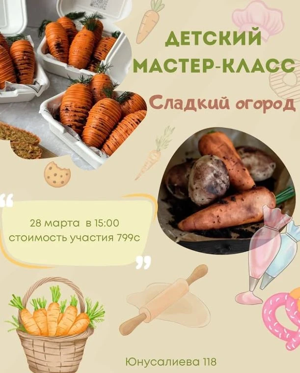 Дети смогут проявить свои кулинарные таланты, готовя пирожные «Сладкий огород». Регистрация по телефону 0558193333.