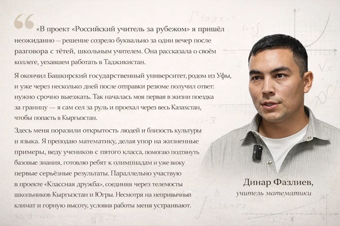 С начала 2024 года около 60 молодых российских педагогов прибыли в различные регионы страны, где они преподают математику, физику, литературу и ведут кружки по робототехнике и ораторскому мастерству. Вместе с кыргызскими коллегами они внедряют новые методы обучения, обсуждают методические подходы и создают современные условия для образования.