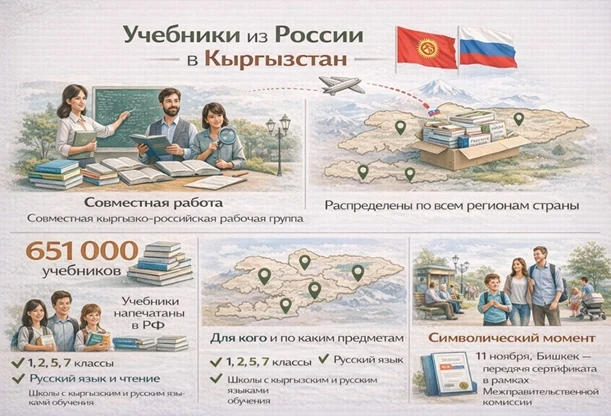 Работа над содержанием учебников велась совместной кыргызско-российской рабочей группой, состоящей из педагогов и экспертов. В результате было доставлено 651 тысяча экземпляров учебников, которые уже распределены по школам и включены в учебный процесс.