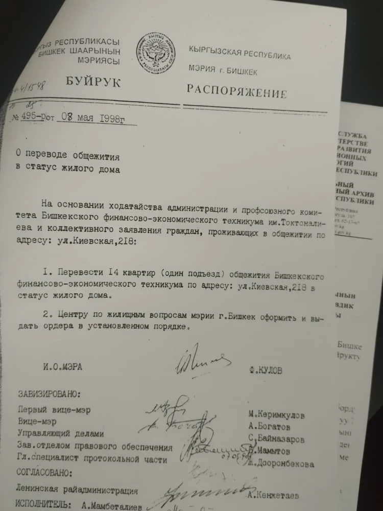 Жители подчеркивают, что мэрия Бишкека выдала распоряжение, изменяющее статус помещений на жилые квартиры. На основании этого документа были получены технические паспорта для всех 15 квартир, и они стали частной собственностью. По их словам, весь процесс приватизации был законным, и у них есть все соответствующие документы.