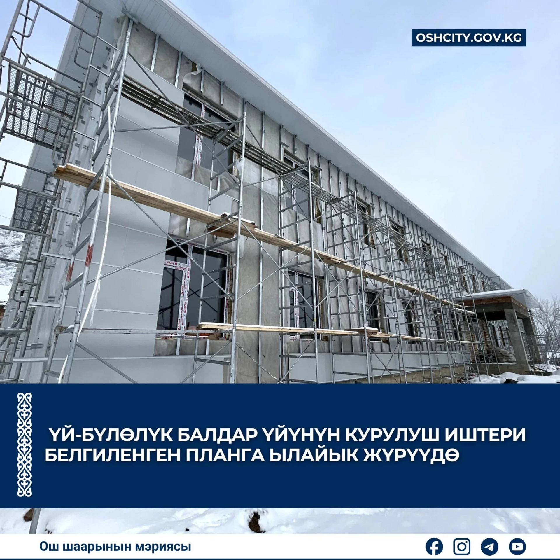 В Оше успешно продолжается строительство семейного детского дома. Эта информация была предоставлена пресс-службой мэрии южной столицы.