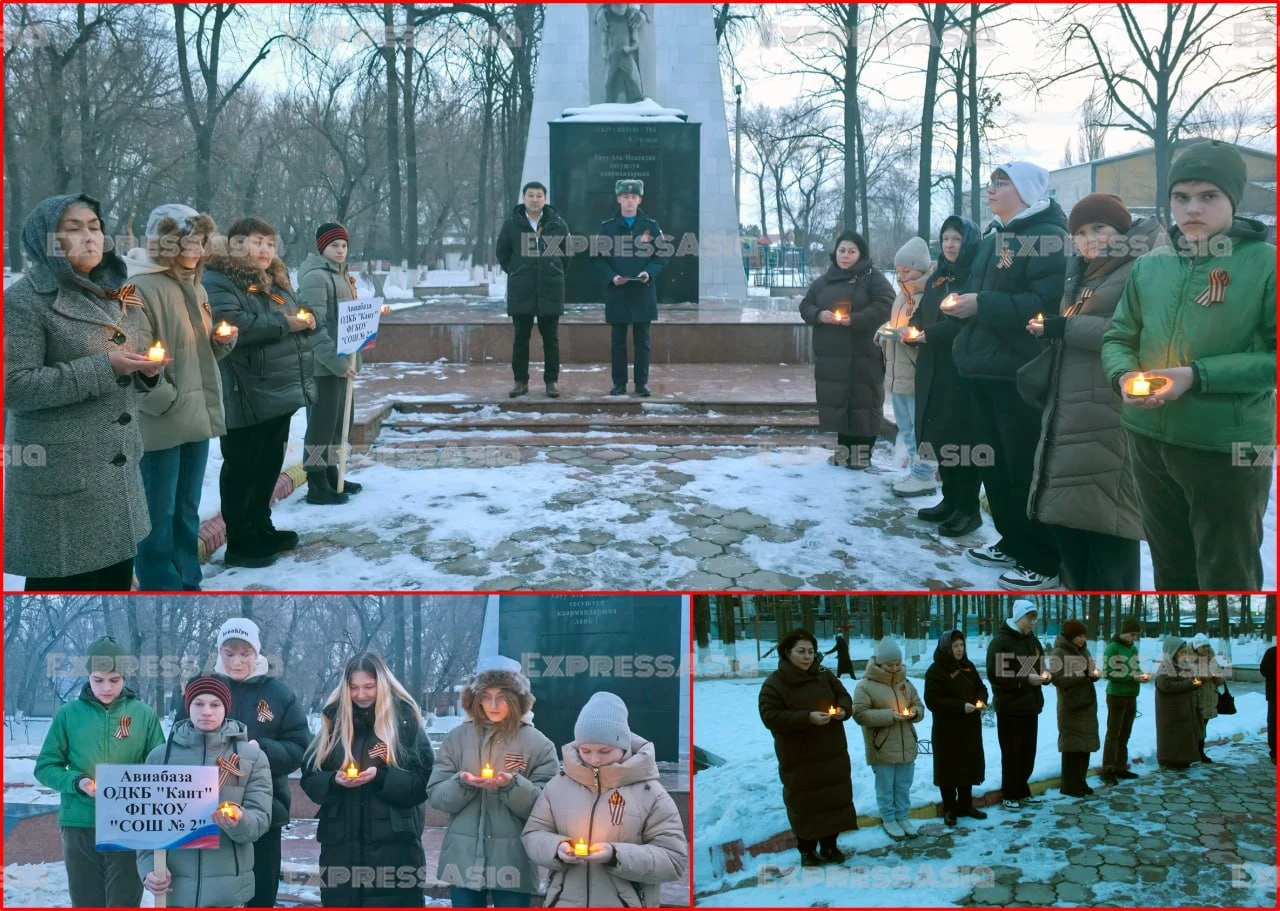 У памятника героям Великой Отечественной войны собрались представители городской администрации, сотрудники Чуйской областной библиотеки, школьники и военнослужащие российской авиационной базы.