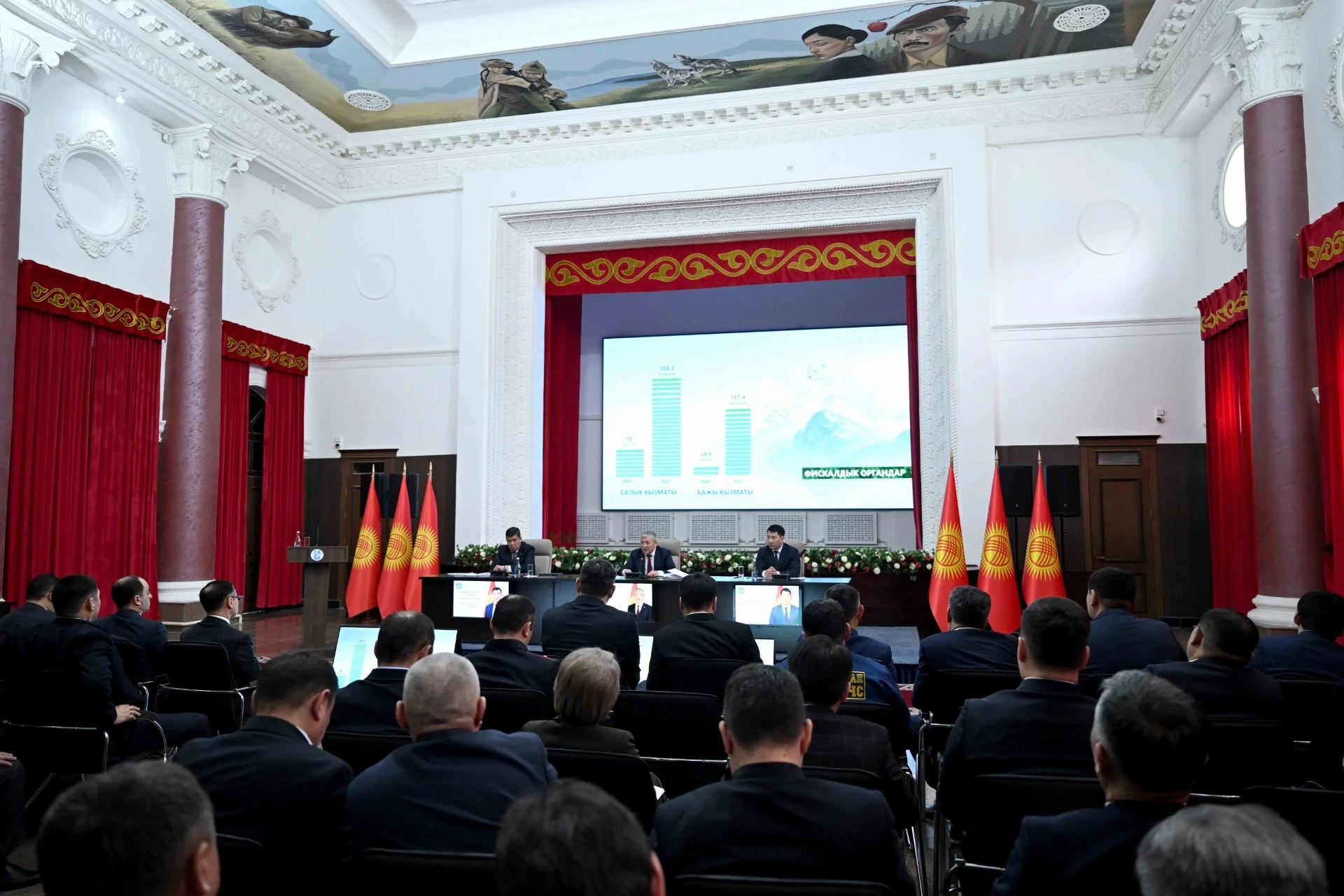 Касымалиев отметил, что за последние пять лет консолидированный бюджет страны увеличился в пять раз, превысив 1 триллион сомов. Бишкек продолжает оставаться основным финансовым центром: из 304 миллиардов сомов, собранных Государственной налоговой службой, 198 миллиардов 7 миллионов сомов (примерно 65 процентов) приходятся на столицу. Он также призвал силовые и фискальные органы прекратить необоснованные проверки бизнеса.