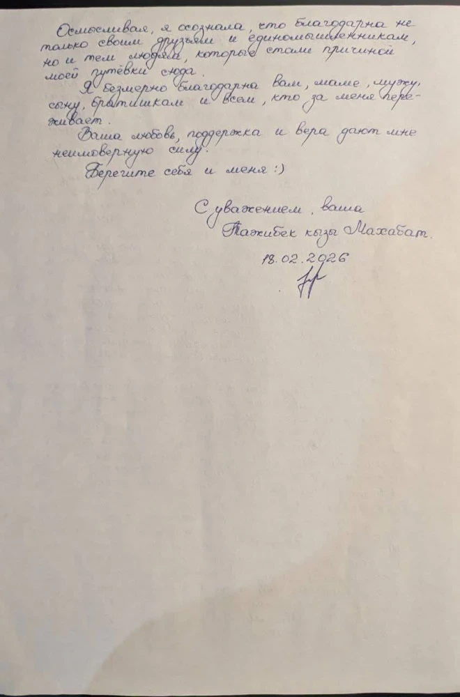 В своем письме Махабат поблагодарила всех, кто писал ей, подчеркивая, что в моменты одиночества именно слова поддержки помогали ей продолжать идти вперед. "Ваши письма вдохновляли меня и дарили надежду", — написала она.
