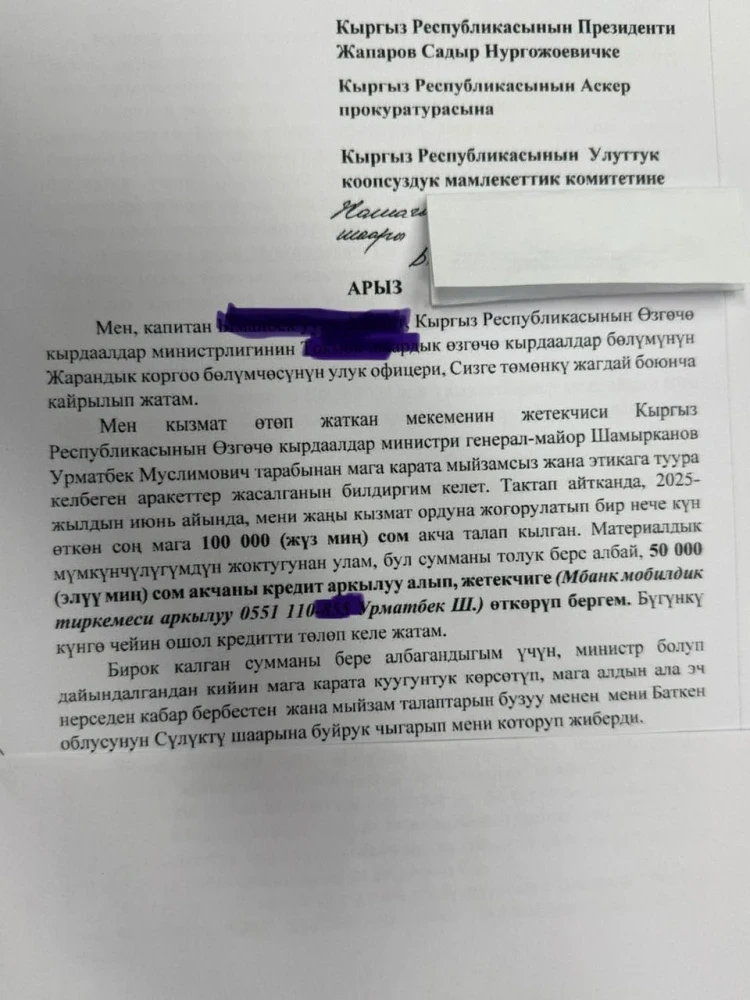 Алагозов сообщил, что летом 2025 года Шамырканов запросил деньги за содействие в повышении одного из сотрудников министерства. По словам этого сотрудника, он перевел половину оговоренной суммы на электронный кошелек Шамырканова, но после назначения последнего министром, не смог передать оставшуюся часть. В ответ на это Шамырканов перевел его в Баткенскую область.