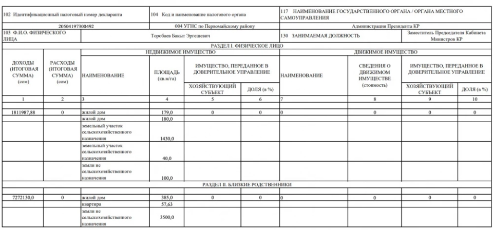 Глава энергетического сектора страны Ибраев Таалайбек указал в своей декларации, что владеет домом на участке в 1 200 кв. м и заработал 2 млн 783 тыс. 154,19 сома. У его родственников также есть дом на участке в 1 239 кв. м.
