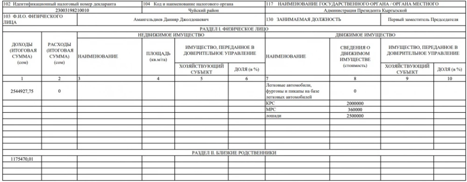 По данным его родственников, их доход составил 7 млн 272 тыс. 130 сомов, также указано владение домом (385 кв. м), квартирой (56 кв. м) и земельным участком не сельхозназначения в 3 500 кв. м. В предыдущие годы их доходы были выше, согласно данным.