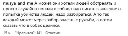По словам очевидцев, инцидент произошел после того, как соседи подали жалобу на женщину, у которой было много собак. На ее участок прибыли незнакомцы, не представившиеся и не имеющие никаких документов или судебного разрешения. Они забрались на забор частного дома и начали стрелять на частной территории, утверждают свидетели событий.