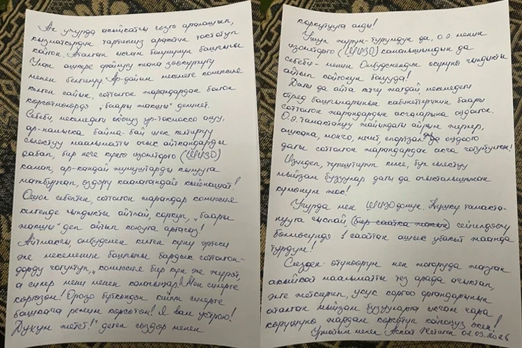 В своем обращении Жетиген призывает к защите и широкой огласке, считая действия администрации грубым нарушением прав человека. Он рассказал, что 2 марта 2026 года начальник оперативного отдела по имени Улан без законных оснований поместил его в ШИЗО, ответив на вопрос о причинах угрозами.