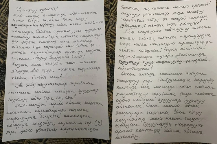 «Не реже четырех раз в неделю, начиная с вечера и до утра, они топят баню для себя. Такое злоупотребление продолжается уже год. Кроме того, за доступ в спортзал сотрудники берут 2000 сомов, ограничивая права осужденных на занятия спортом. Сами же работники пользуются спортзалом без каких-либо ограничений, даже в рабочее время», — сообщает Аскат Жетиген.