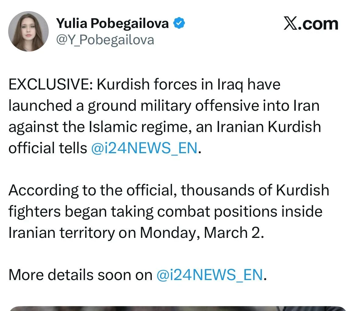 Курдские силы Ирака начали наступление на Иран, как сообщает израильская журналистка Юлия Побегайлова.