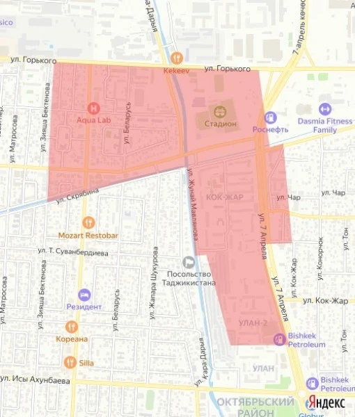 - линию железной дороги — улицу Фрунзе — реку Аламедин — улицу Панфилова;