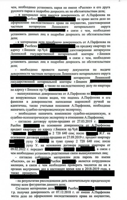 В результате Александр оказался втянутым в обмен двухкомнатной квартиры в центре Бишкека на комнату в общежитии на улице Кольбаева.26 марта 2019 года к нему пришли Рысбек и его спутник. В тот день Александр находился в тяжелом состоянии от алкогольного опьянения. Утром его отвезли к нотариусу, который находился напротив Госрегистра, где он подписал доверенность на имя Рысбека с правом распоряжения имуществом.