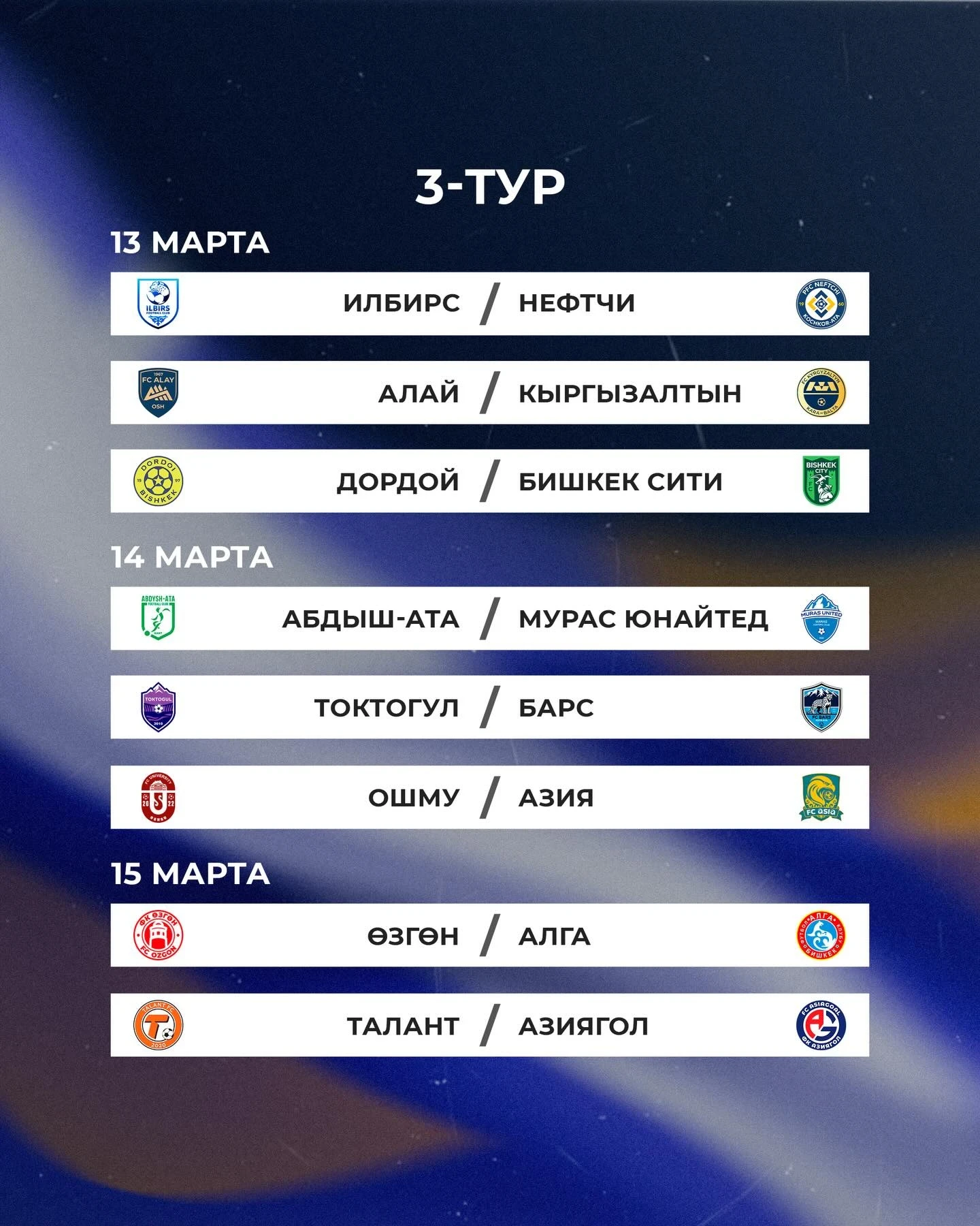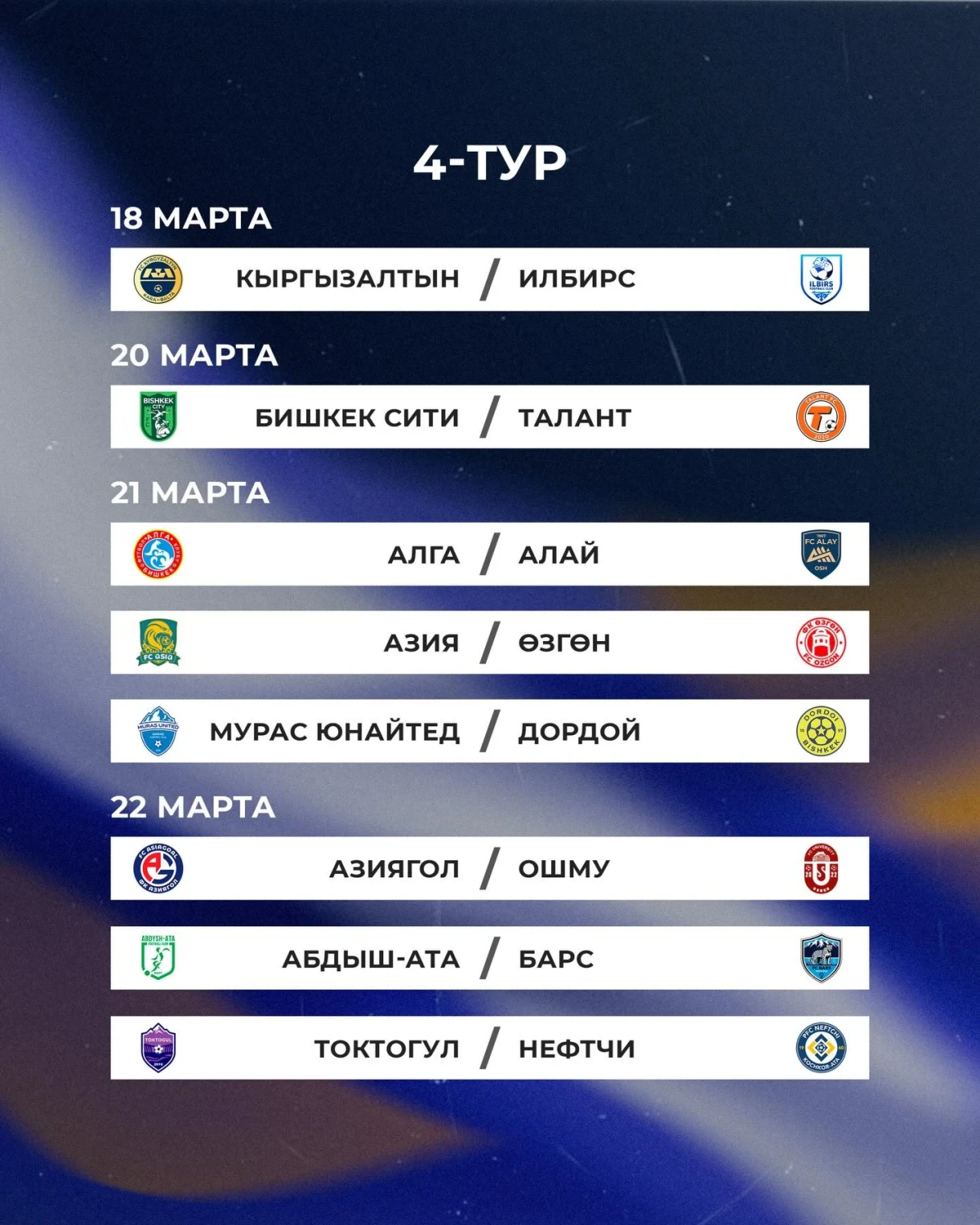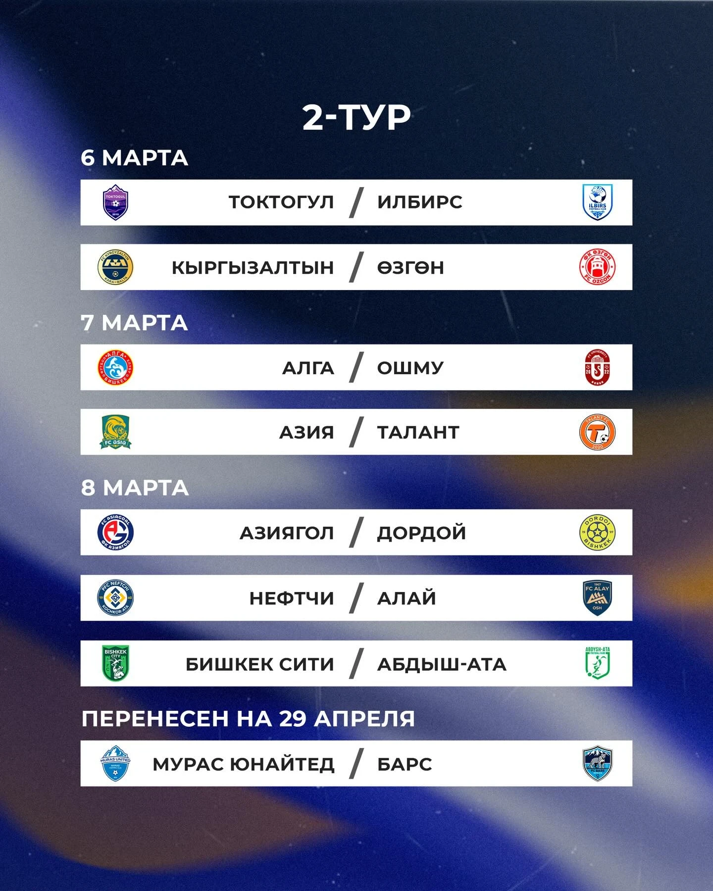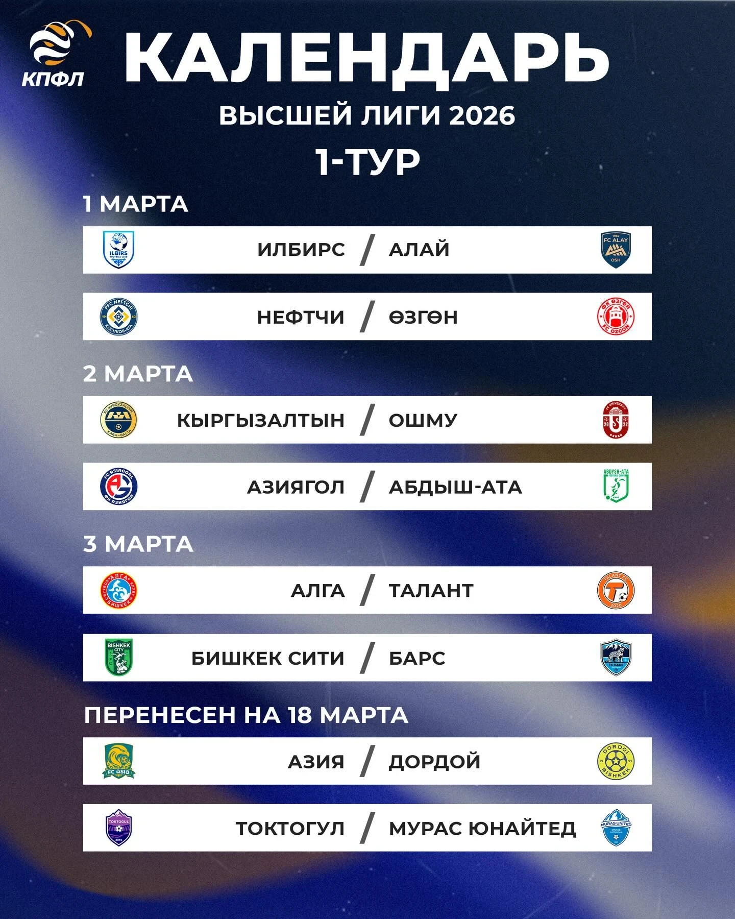 Матчи между командами «Токтогул» и «Мурас Юнайтед», а также «Азия» и «Дордой» перенесены на 18 марта.