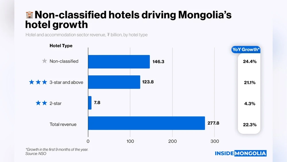 «Гостиничный и туристический сектор Монголии продолжает демонстрировать положительную динамику: по информации Национального статистического комитета, выручка сектора за первые девять месяцев 2025 года увеличилась на 22.3% по сравнению с аналогичным периодом 2024 года, составив ₮277.8 млрд», — сообщает InsideMongolia.